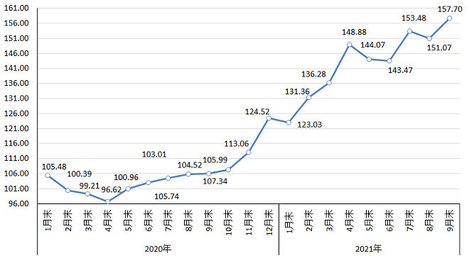 據(jù)鋼鐵協(xié)會監(jiān)測,9月末,中國鋼材價格指數(shù)(CSPI)為157.70點,比8月末上升6.63點,升幅為4.39%,環(huán)比由降轉(zhuǎn)升;與上年同期相比上升51.71點,升幅為48.79%。(見下圖)