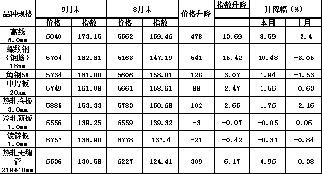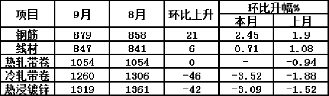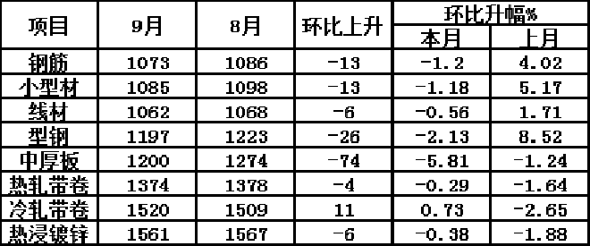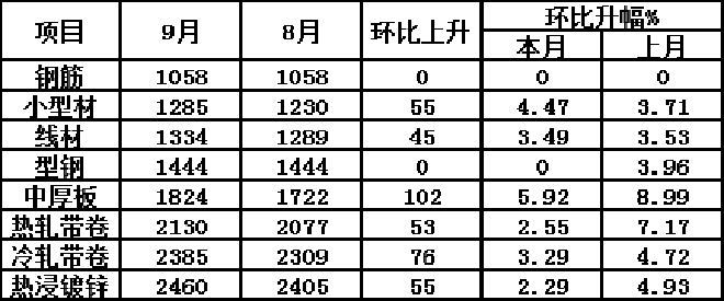 9月末,在鋼鐵協(xié)會監(jiān)測的八大鋼材品種中,除冷軋薄板和鍍鋅板價格分別小幅下降3元/噸和21元/噸外,其它品種價格均由降轉(zhuǎn)升。其中,高線、螺紋鋼、熱軋無縫管回升幅度較大,環(huán)比分別上升478元/噸、541元/噸和309元/噸;角鋼、中厚板和熱軋卷板升幅相對較小,環(huán)比分別上升128元/噸、88元/噸和102元/噸。(見下表)