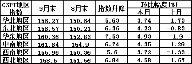 9月份,CSPI全國六大區(qū)域指數(shù)均由降轉(zhuǎn)升。其中:華東市場升幅相對較大,環(huán)比上升4.93%;西南地區(qū)升幅相對較小,環(huán)比上升3.72%;華北、東北、中南和西北地區(qū)環(huán)比升幅分別為3.74%、4.23%、4.35%和4.58%。(見下表)