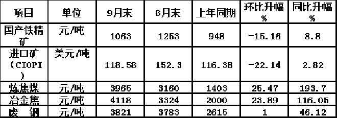 9月份,鐵礦石價格有所回落,但煤焦、廢鋼等原燃料價格環(huán)比繼續(xù)上升。據(jù)鋼鐵協(xié)會監(jiān)測,9月末,國產(chǎn)鐵精礦價格環(huán)比下降190元/噸,CIOPI進(jìn)口礦價格環(huán)比下降33.72美元/噸;煉焦煤和冶金焦價格環(huán)比分別上升805元/噸和794元/噸,廢鋼價格環(huán)比上升38元/噸。從同比情況看,國產(chǎn)鐵精礦和進(jìn)口礦分別同比上漲8.80%和2.82%,煉焦煤和冶金焦價格分別同比上漲193.70%和116.05%,廢鋼價格同比上漲46.12%。鐵礦石及煤焦、廢鋼價格仍居高位,推升了企業(yè)的鋼材成本。(見下表)