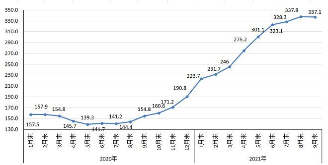 9月份,國際鋼材價格指數(shù)(CRU)為337.1點,環(huán)比下降0.7點,降幅為0.2%,環(huán)比由升轉(zhuǎn)降;與上年同期相比上升182.3點,升幅為117.8%。(見下圖、表)