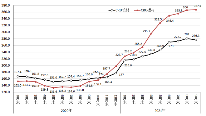 9月份,CRU長材指數(shù)為276.3點,環(huán)比下降4.7點,降幅為1.7%;CRU板材指數(shù)為367.4點,環(huán)比上升1.4點,升幅為0.4%;與去年同期相比,CRU長材指數(shù)同比上升115.7點,升幅為72.0%;CRU板材指數(shù)同比上升215.6點,升幅為142.0%。(見下圖)