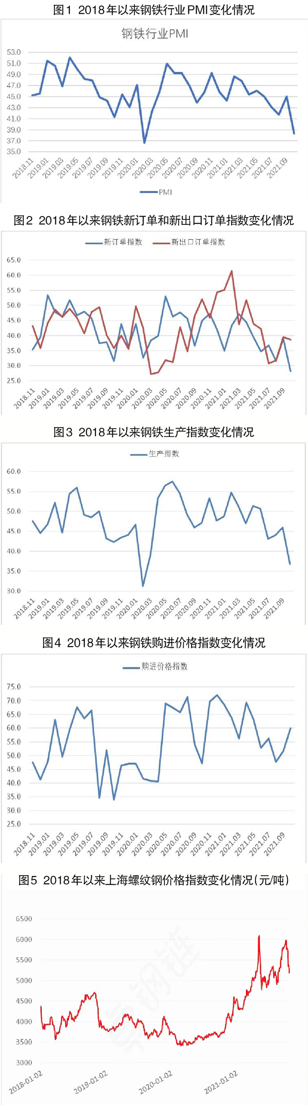 從本會調查、發布的鋼鐵PMI(采購經理指數)來看,10月份鋼鐵PMI為38.3%,環比下降6.7個百分點,鋼鐵行業偏緊運行。分項指數顯示,在壓產政策和能耗雙控政策的影響下,市場需求有所抑制,鋼鐵生產繼續下降。原材料價格整體上行,鋼廠成本有所上升。鋼材價格則受多方面因素影響連續下降,鋼廠利潤受到影響。