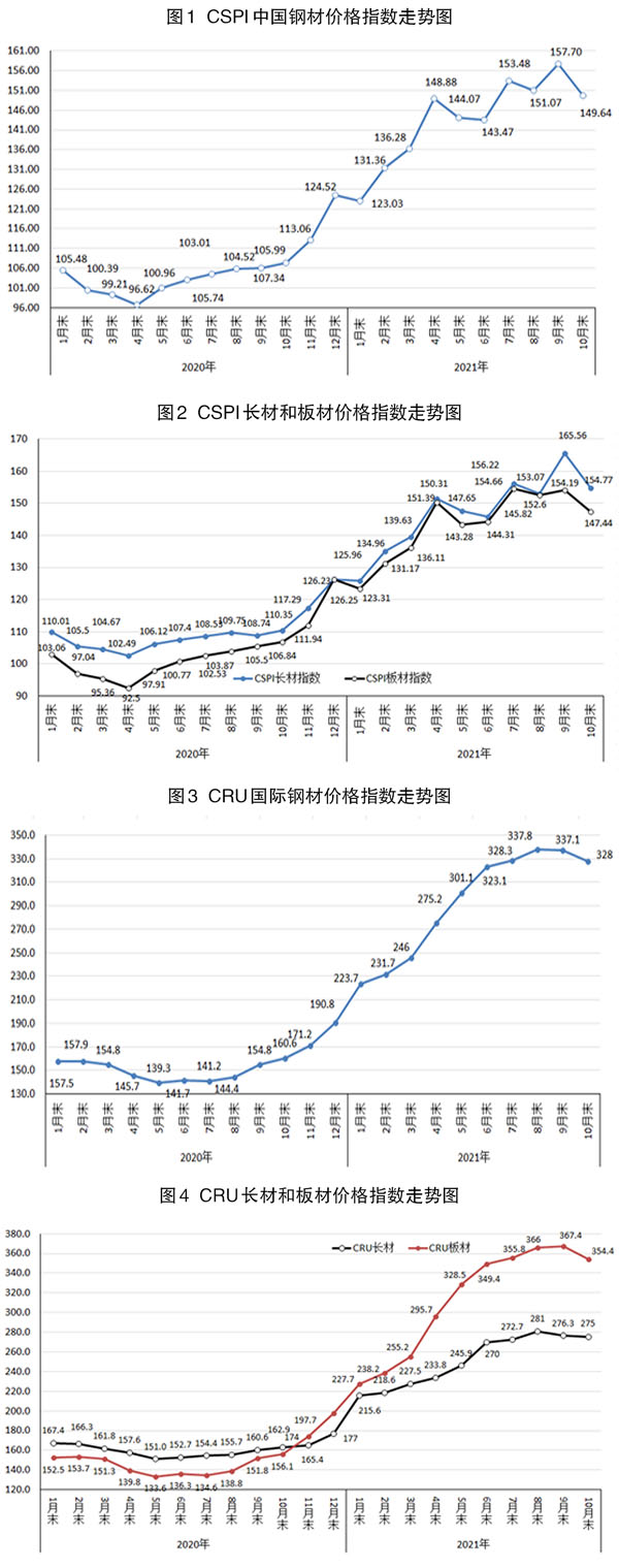 10月份,國際鋼材價格指數(CRU)為328.0點,環比下降9.1點,降幅為2.7%,較9月份加大2.5個百分點;同比上升165.1點,升幅為101.4%。(見圖3、表6)