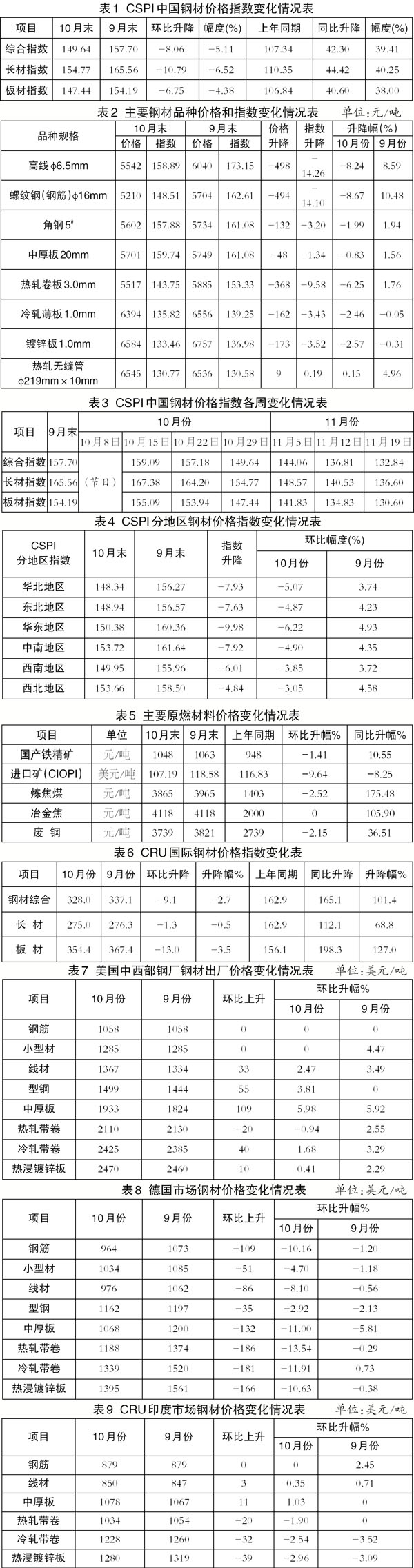 10月份,國慶假期結束后,CSPI鋼材價格指數曾小幅上升,但后兩周持續下降;進入11月份,鋼材價格繼續呈下行走勢,且降幅有所加大。(見表3)