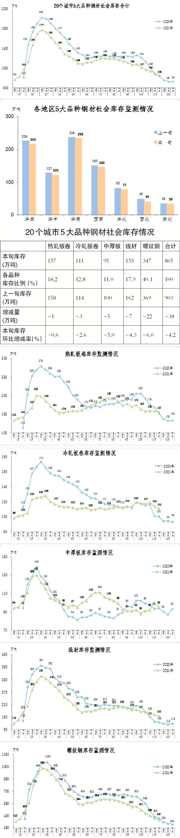 11月下旬,20個城市5大品種鋼材社會庫存865萬噸,環(huán)比減少38萬噸,下降4.2%,庫存連續(xù)下降;比10月下旬減少104萬噸,下降10.7%;比年初增加135萬噸,上升18.5%;同比增加28萬噸,上升3.3%。