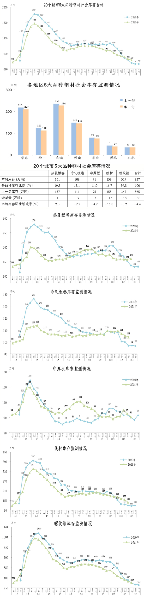 12月上旬,20個(gè)城市5大品種鋼材社會(huì)庫存827萬噸,環(huán)比減少38萬噸,下降4.4%,庫存繼續(xù)下降;比2021年初增加97萬噸,上升13.3%;同比增加67萬噸,上升8.8%。