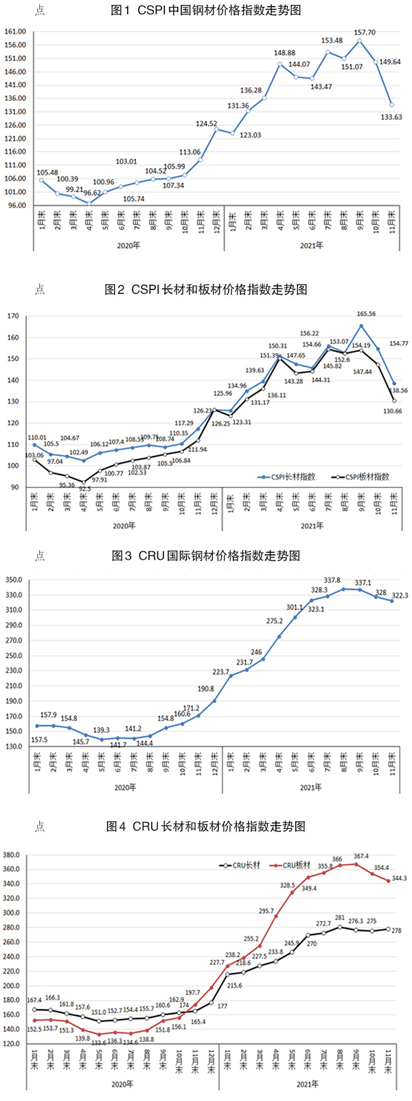 11月份,CRU長材指數為278.0點,環比上升3.0點,升幅為1.1%,環比由降轉升;CRU板材指數為344.3點,環比下降10.1點,降幅為2.8%,環比降幅收窄0.7個百分點;CRU長材指數同比上升112.6點,升幅為68.1%;CRU板材指數同比上升170.3點,升幅為97.9%。(見圖4)