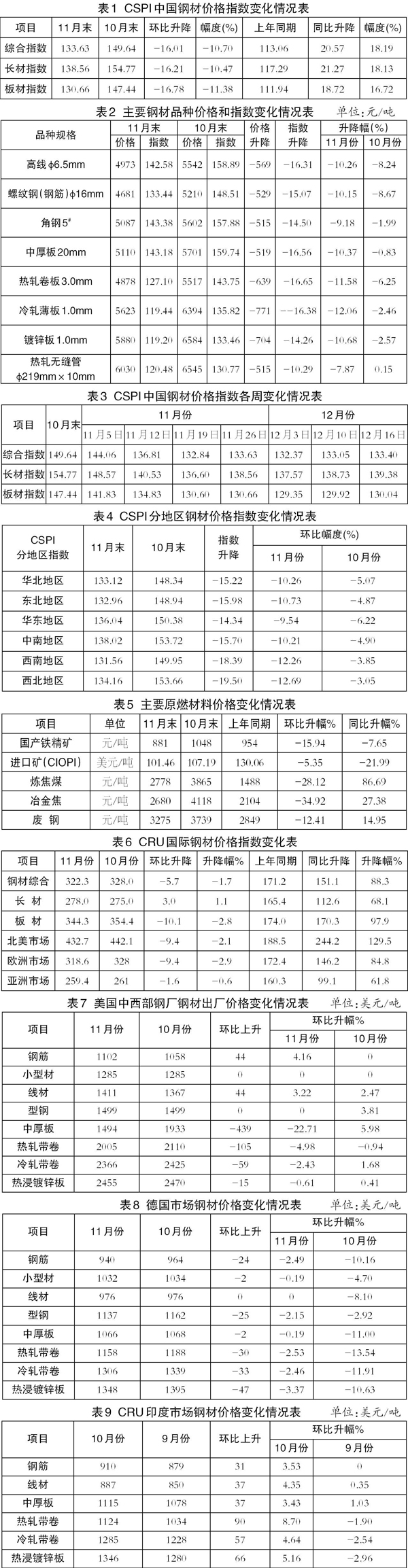 11月份,粗鋼產量總體平穩,但主要用鋼行業仍需求不振,煤炭、焦炭價格明顯回落,疊加部分地區疫情反復和極端天氣等因素,鋼材價格環比降幅加大。