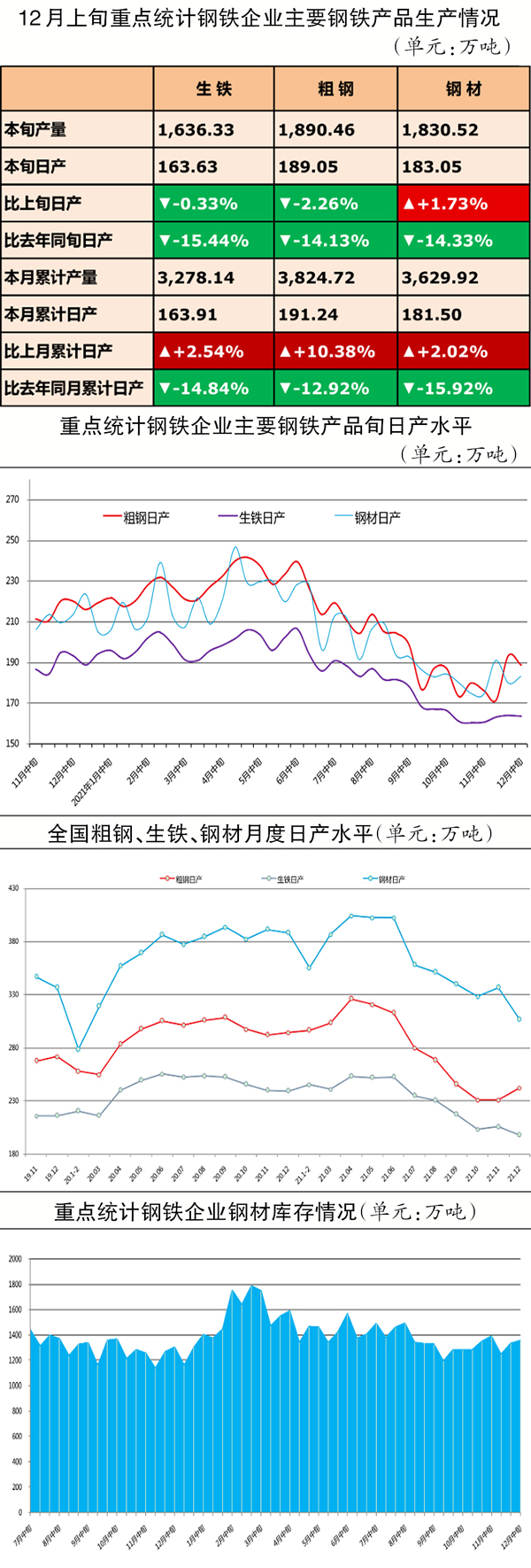 根據2021年12月中旬旬報的統計,2021年12月份(即累計到12月中旬)重點統計鋼鐵企業累計粗鋼日產191.24萬噸, 環比2021年11月份增長10.38%,同比下降12.92%;生鐵日產163.91萬噸,環比增長2.54%,同比下降14.84%;鋼材日產181.50萬噸,環比增長2.02%,同比下降了15.92%。