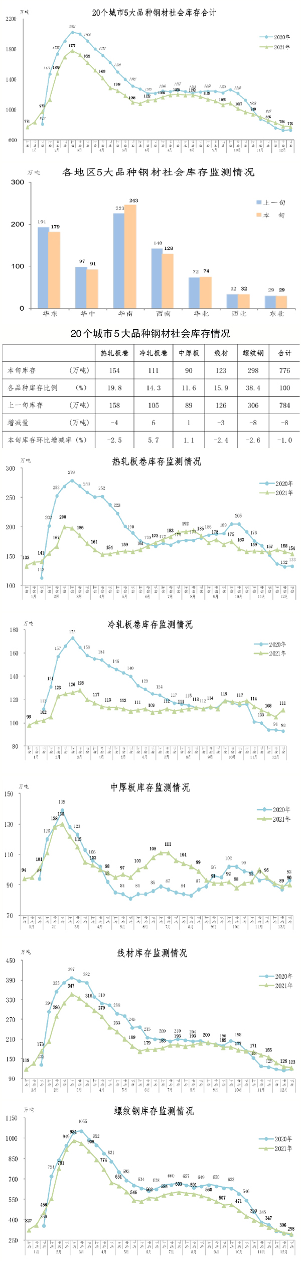 2021年12月下旬,20個(gè)城市5大品種鋼材社會(huì)庫(kù)存為776萬(wàn)噸,環(huán)比減少8萬(wàn)噸,下降1.0%,庫(kù)存降幅較前期有所收窄;比2021年11月下旬減少89萬(wàn)噸,下降10.3%;比2021年初增加46萬(wàn)噸,上升6.3%。