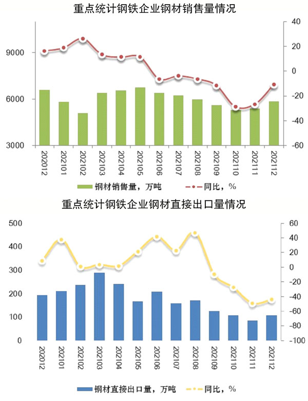 上述統(tǒng)計(jì)數(shù)據(jù)表明:受限產(chǎn)、限電、下游行業(yè)用鋼需求減弱等因素的影響,自2021年6月份以來,重點(diǎn)統(tǒng)計(jì)鋼鐵企業(yè)鋼材銷售連續(xù)下降,但在振作工業(yè)經(jīng)濟(jì)運(yùn)行政策措施的引領(lǐng)下,鋼鐵行業(yè)需求逐步企穩(wěn)回升,日銷環(huán)比連續(xù)2個月上升。隨著國家取消鋼材出口退稅,鋼材出口同比連續(xù)4個月下降,鋼材直接出口量呈減少態(tài)勢,雖然2021年12月份有所回升,環(huán)比上升26.40%,但仍處于低位。鋼材產(chǎn)銷率當(dāng)月小幅下降,鑒于季節(jié)性、環(huán)境性等多重因素對需求端的影響,鋼鐵供需變化仍需密切跟蹤和關(guān)注,以實(shí)現(xiàn)供需動態(tài)平衡。