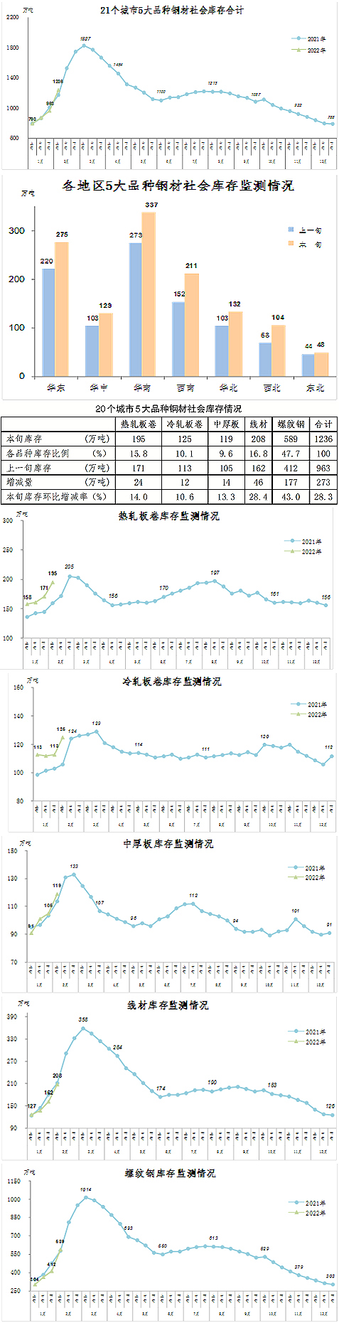 注:從2022年開始,鋼材社會庫存重點監測城市由20個增加到21個,增加城市為蘭州,旬報中社會庫存總量和5大品種庫存量的上年數據均同口徑做出調整。
