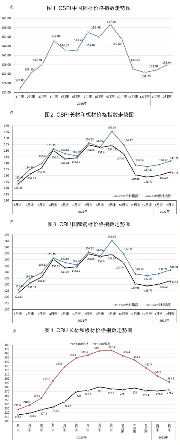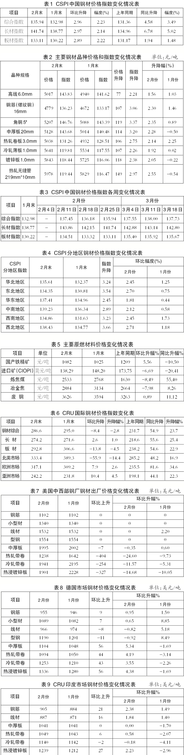 2月末,CSPI長材指數為141.74點,環比上升2.97點,升幅為2.14%;CSPI板材指數為133.11點,環比上升2.89點,升幅為2.22%。長材、板材指數分別同比上升6.78點和1.94點,升幅分別為5.02%和1.48%。(見圖2、表1)