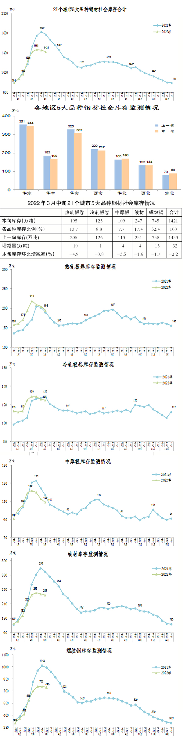 3月中旬,21個城市5大品種鋼材社會庫存為1421萬噸,環(huán)比減少32萬噸,下降2.2%,庫存繼續(xù)呈下降走勢;比年初增加633萬噸,上升80.3%;同比減少351萬噸,下降19.8%。