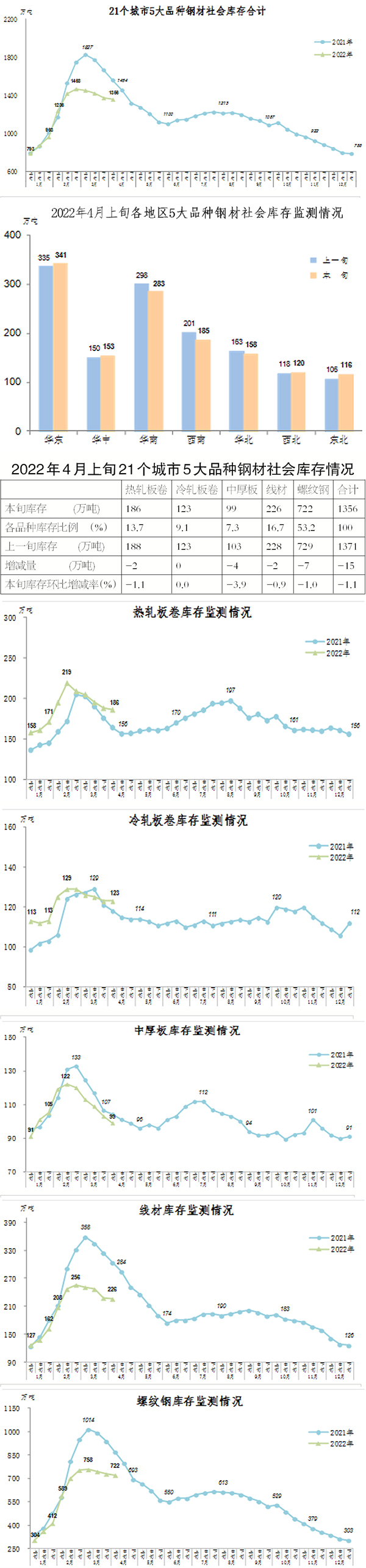 注:從2022年開始,鋼材社會(huì)庫存重點(diǎn)監(jiān)測城市由20個(gè)增加到21個(gè),增加城市為蘭州,旬報(bào)中社會(huì)庫存總量和5大品種庫存量的上年數(shù)據(jù)均同口徑做出調(diào)整。