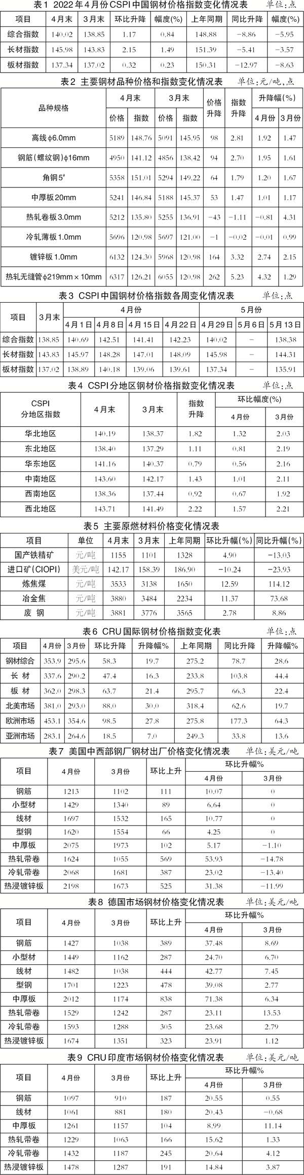 4月份,CSPI綜合指數窄幅波動;進入5月份以來,中國鋼材價格指數有所回落。(見表3)