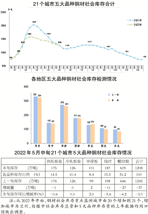 5月中旬,21個(gè)城市五大品種鋼材社會庫存為1208萬噸,環(huán)比減少37萬噸,下降3.0%,庫存繼續(xù)小幅下降;比今年初增加420萬噸,上升53.3%;同比增加2萬噸,上升0.2%。