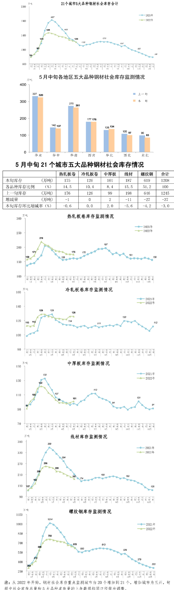 5月中旬,21個城市五大品種鋼材社會庫存為1208萬噸,環比減少37萬噸,下降3.0%,庫存繼續小幅下降;比今年初增加420萬噸,上升53.3%;同比增加2萬噸,上升0.2%。
