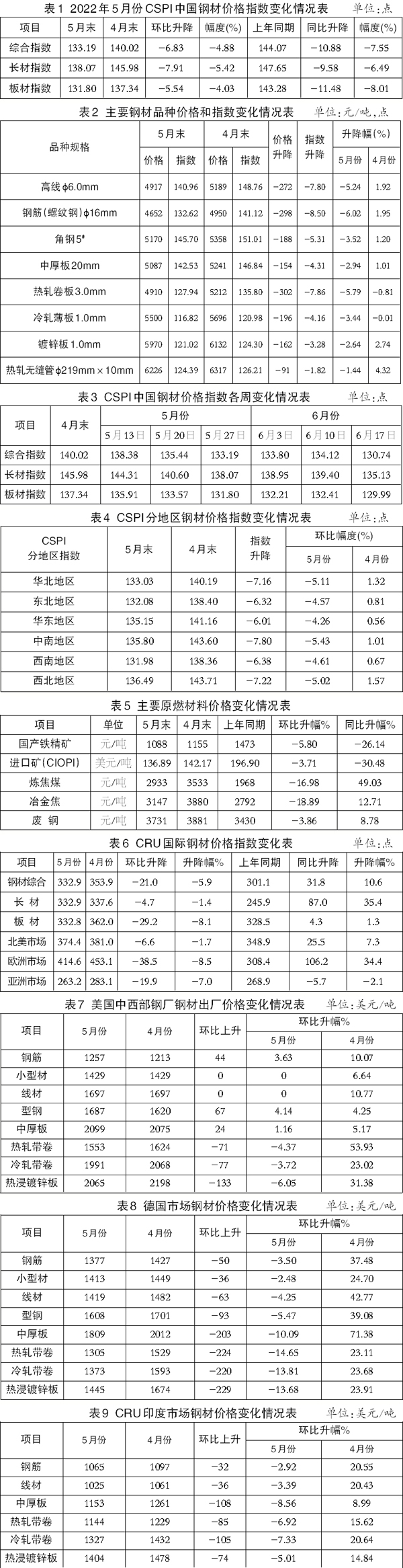 二是原燃料價格雖有所下降,但總體仍居高。據鋼協監測,5月末,CIOPI進口鐵礦石價格為136.89美元/噸,較今年初上漲15.09%,煉焦煤、冶金焦和廢鋼價格分別比今年初上漲22.06%、23.56%和6.02%。同期,CSPI中國鋼材價格指數較今年初僅上升1.13%。原燃料價格雖環比下降,但處于高位,對鋼鐵企業形成的成本壓力仍較為明顯。