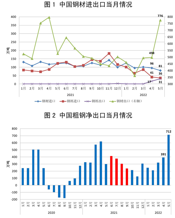 1月—5月份,我國累計(jì)出口鋼材2591.5萬噸,同比減少16.2%;累計(jì)進(jìn)口鋼材498.0萬噸,同比減少18.3%;累計(jì)進(jìn)口鋼坯328.6萬噸,同比減少26.1%;累計(jì)出口鋼坯47.7萬噸,同比顯著增加;折合粗鋼凈出口1879.6萬噸,同比減少253.4萬噸。