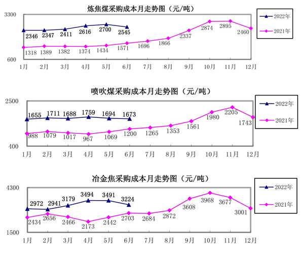 2022年1月—6月份,煉焦煤采購成本累計同比增長76.60%,冶金焦同比增長29.24%;國產(chǎn)鐵精礦同比下降21.22%,進口粉礦同比下降24.46%;廢鋼同比增長7.48%。
