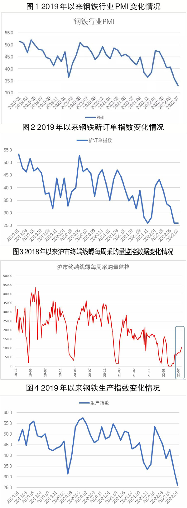 7月份,國內鋼材市場需求低位運行,恢復較為緩慢。多個原因導致市場需求不足:一是高溫多雨天氣持續,導致鋼材市場進入短期季節性淡季。二是主要用鋼方——房地產的投資情況不樂觀,對鋼材需求的支撐繼續弱化。1月—6月份,房地產開發投資同比下降5.4%,房屋新開工面積下降34.4%,6月份房地產開發景氣指數為95.40點,已經低于理論臨界點。當前國內房地產行業形勢短期內難有改變。三是國際形勢更加嚴峻復雜,主要經濟體下行壓力加大,外部需求有所收縮。結合來看,7月份鋼材需求繼續收縮,新訂單指數為25.9%,與6月份持平,連續兩個月位于30%以下。新出口訂單指數為39.4%,較6月份下降7.7個百分點。鋼材終端市場啟動緩慢,市場信心顯著不足。從監測的滬市終端線螺采購數據來看,7月份上海終端采購量恢復有限,遠低于往年同期水平。