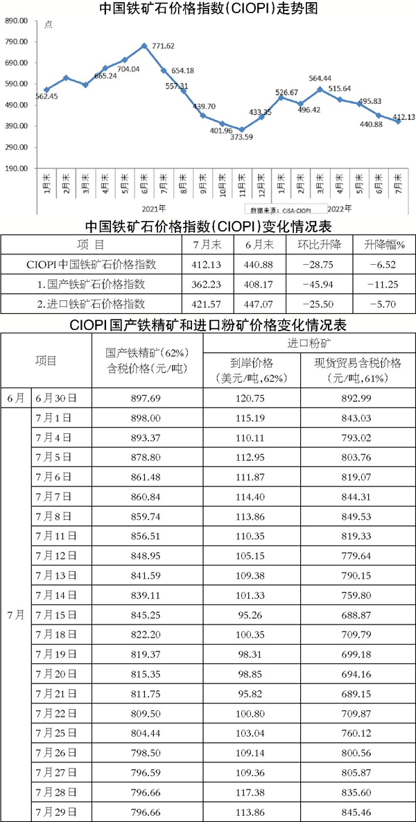 據(jù)鋼協(xié)監(jiān)測,7月末,中國鐵礦石價(jià)格指數(shù)(CIOPI)為412.13點(diǎn),環(huán)比下降28.75點(diǎn),降幅為6.52%,較6月收窄4.56個(gè)百分點(diǎn);同比下降242.5點(diǎn),降幅為37.00%。