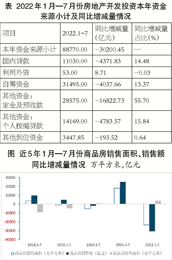 從房地產(chǎn)業(yè)本年資金來(lái)源小計(jì)構(gòu)成中可知,本年資金來(lái)源同比大幅下降主要與銷售回款(定金及預(yù)收款、個(gè)人按揭貸款)同比大幅下降有關(guān)。1月—7月份,累計(jì)定金及預(yù)收款為28575億元,同比減少16822.73億元,降幅37.10%(去年同期為同比增長(zhǎng)38.30%);個(gè)人按揭貸款為14169億元,同比減少4783.57億元,降幅25.20%(去年同期為同比增長(zhǎng)17.00%)。從本年資金來(lái)源小計(jì)各分項(xiàng)指標(biāo)同比增減量看,二者對(duì)本年資金來(lái)源小計(jì)合計(jì)減量的貢獻(xiàn)率分別為55.70%和15.84%,合計(jì)貢獻(xiàn)率超過70%。