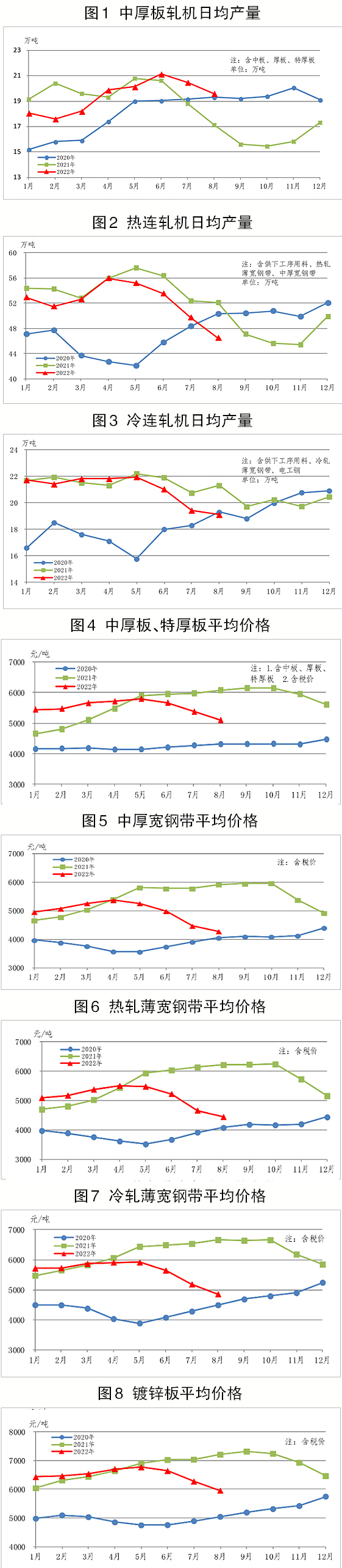 8月份,重點統計企業中厚板軋機、熱連軋和冷連軋機產量環比均有不同程度下降;中厚板軋機產量同比上升,熱連軋和冷連軋機產量同比下降。主要品種板中,造船板、管線鋼板和汽車板產量同比增幅較大,集裝箱板、家電板和電工鋼板產量同比降幅較大。