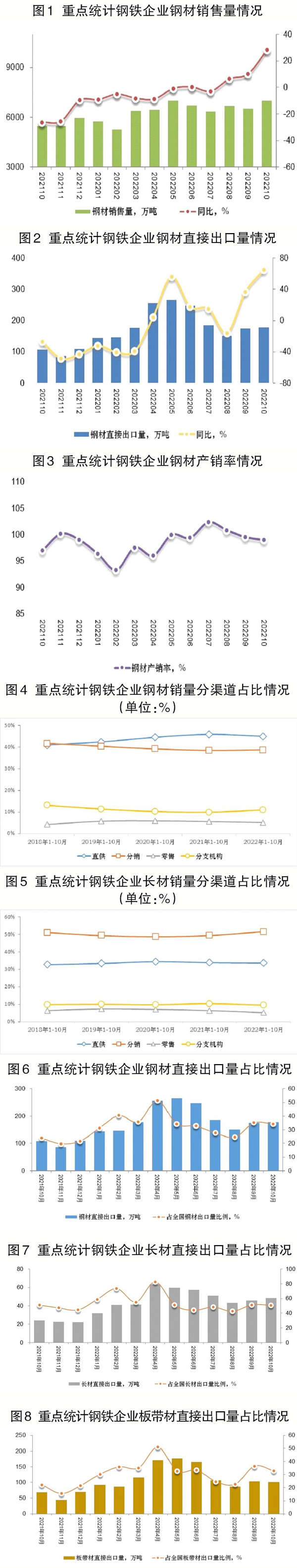 上述統(tǒng)計數(shù)據(jù)表明:10月份,國民經(jīng)濟總體上延續(xù)了恢復(fù)態(tài)勢,經(jīng)濟社會發(fā)展大局保持穩(wěn)定,鋼鐵企業(yè)積極采取各類應(yīng)對措施,在努力達到供需平衡方面取得了階段性成效,當(dāng)月鋼材銷售量同比、日銷環(huán)比上升。面對更趨復(fù)雜嚴(yán)峻的國際環(huán)境,世界經(jīng)濟下行風(fēng)險上升,我國一系列政策舉措加力提效,出口呈現(xiàn)較強發(fā)展韌性,10月份鋼材直接出口量環(huán)比、同比繼續(xù)上升。廣大會員鋼鐵企業(yè)對市場環(huán)境的適應(yīng)性正在逐漸增強,堅持“三定三不要”經(jīng)營原則,堅持按合同組織生產(chǎn),鋼材產(chǎn)銷率保持在100%左右。受新冠肺炎疫情多點散發(fā)、市場需求不振等因素影響,鋼鐵企業(yè)生產(chǎn)經(jīng)營依然面臨較多困難和挑戰(zhàn),鋼鐵供需變化仍需密切跟蹤和關(guān)注,以實現(xiàn)供需動態(tài)平衡。