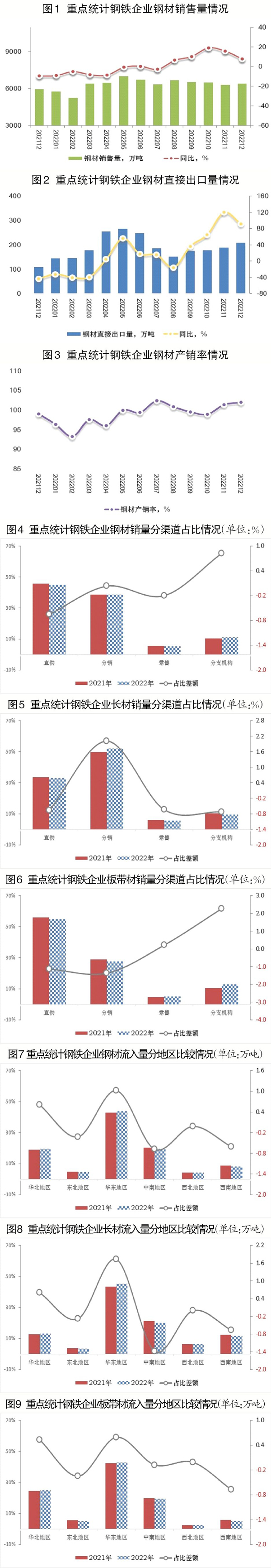 從中國鋼鐵工業(yè)協(xié)會重點統(tǒng)計鋼鐵企業(yè)鋼材營銷統(tǒng)計數(shù)據(jù)來看,2022年12月份,重點統(tǒng)計鋼鐵企業(yè)銷售鋼材6409.92 萬噸,比2021年同期上升7.59%;鋼材日銷水平為206.77萬噸,日銷環(huán)比下降1.66%。其中,國內(nèi)銷售鋼材6201.42萬噸,比2021年同期上升6.03%;直接出口鋼材208.50萬噸,環(huán)比上升10.11%,比2021年同期上升91.06%。2022年12月份,鋼材產(chǎn)銷率為102.02%,環(huán)比上升0.60個百分點,同比上升2.96個百分點。