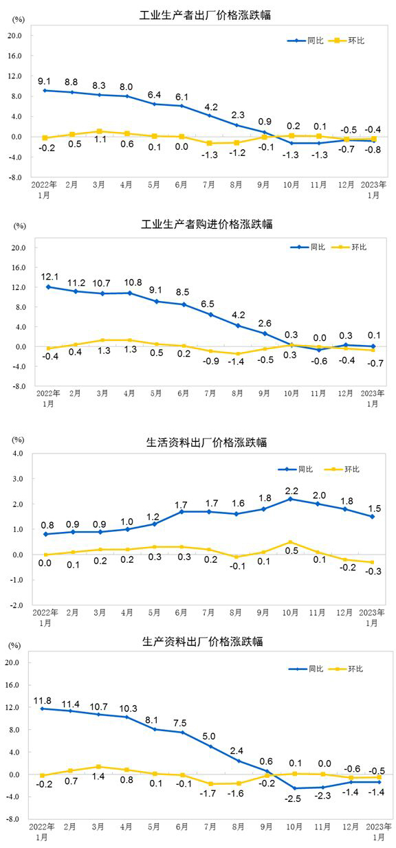 1月份,在其他的工業(yè)生產(chǎn)者購進價格中,燃料動力類價格環(huán)比下降1.3%,同比上漲7.2%;農(nóng)副產(chǎn)品類價格環(huán)比下降2.3%,同比上漲5.2%;建筑材料及非金屬類價格環(huán)比下降0.7%,同比下降5.3%;化工原料類價格環(huán)比下降1.2%,同比下降4.7%;有色金屬材料及電線類價格環(huán)比上漲0.4%,同比下降1.8%。