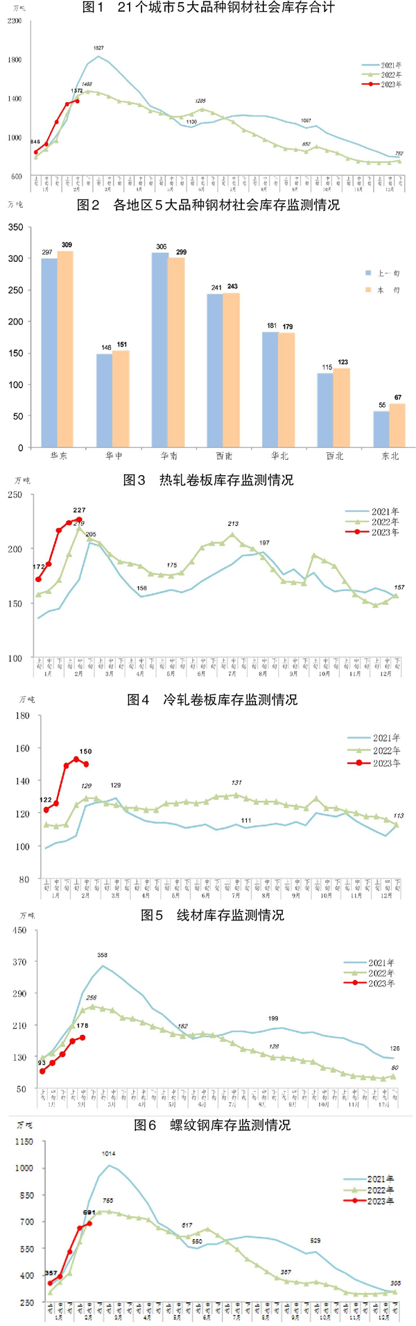 2月中旬,分地區來看,7大區域鋼材社會庫存環比各有升降,具體情況為:東北地區環比增加12萬噸,上升21.8%,為增量和增幅最大地區;華東地區增加12萬噸,上升4.0%;西北地區增加8萬噸,上升7.0%;華中地區增加5萬噸,上升3.4%;西南地區增加2萬噸,上升0.8%;華南地區環比減少7萬噸,下降2.3%;華北地區減少2萬噸,下降1.1%。