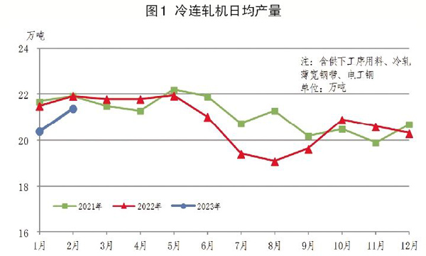 2月份,冷連軋機(jī)生產(chǎn)599萬(wàn)噸,同比減少15萬(wàn)噸,下降2.5%。其中,商品量為400萬(wàn)噸,同比減少22萬(wàn)噸,下降5.1%;供下工序用料為199萬(wàn)噸,同比增加6萬(wàn)噸,上升3.3%。1月—2月份,冷連軋機(jī)累計(jì)生產(chǎn)1248萬(wàn)噸,同比減少33萬(wàn)噸,下降2.6%。
