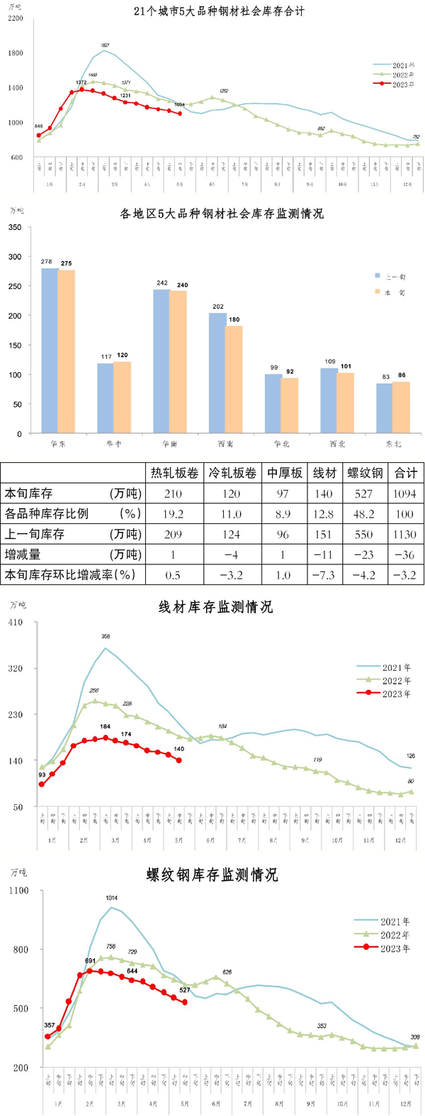5月中旬,分地區(qū)來(lái)看,7大區(qū)域鋼材社會(huì)庫(kù)存環(huán)比除華中地區(qū)、東北地區(qū)有所上升外,其他地區(qū)均呈下降走勢(shì)。具體情況為:西南地區(qū)庫(kù)存環(huán)比減少22萬(wàn)噸,下降10.9%,為減量、降幅最大地區(qū),該地區(qū)已連續(xù)4旬為減量最大地區(qū);華北地區(qū)減少7萬(wàn)噸,下降7.1%;西北地區(qū)減少8萬(wàn)噸,下降7.3%;華東地區(qū)減少3萬(wàn)噸,下降1.1%;華南地區(qū)減少2萬(wàn)噸,下降0.8%;東北地區(qū)和華中地區(qū)庫(kù)存環(huán)比均增加3萬(wàn)噸,上升幅度分別為3.6%和2.6%。