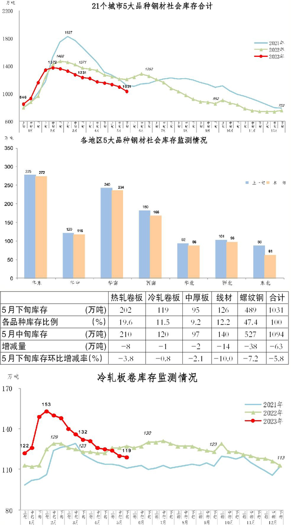 5月下旬,21個城市五大品種鋼材社會庫存為1031萬噸,環(huán)比減少63萬噸,下降5.8%,庫存降幅擴大;比4月下旬減少120萬噸,下降10.4%;比今年初增加279萬噸,上升37.1%;比去年同期減少176萬噸,下降14.6%。