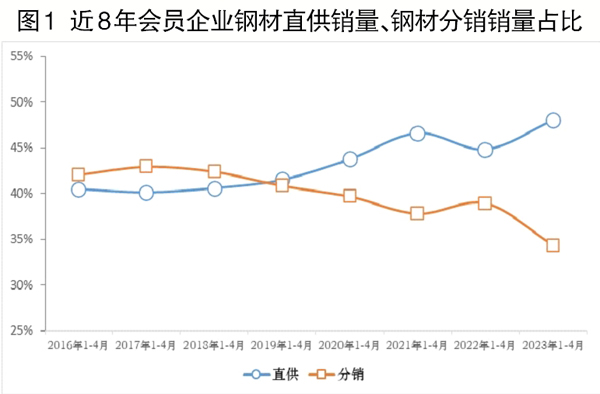 對近8年(2016年—2023年4月份)會員企業鋼材直供銷量占比、鋼材分銷銷量占比進行比較可知,2019年鋼材直供銷量占比為41.47%,高出鋼材分銷銷量占比0.62個百分點,這是自2016年以來會員企業鋼材直供銷量占比首次高于鋼材分銷銷量占比。2022年1月—4月份,會員企業鋼材直供銷量占比提升至44.81%,高出鋼材分銷銷量占比5.87個百分點。2023年1月—4月份,會員企業鋼材直供銷量占比進一步提升至48.01%,高出鋼材分銷銷量占比13.71個百分點。這表明2023年1月—4月份會員企業直供渠道優勢較2022年1月—4月份有了進一步擴大。