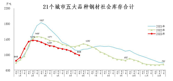 6月上旬,21個城市五大品種鋼材社會庫存為989萬噸,環比減少42萬噸,下降4.1%,庫存繼續下降;比今年初增加237萬噸,上升31.5%;比去年同期減少249萬噸,下降20.1%。