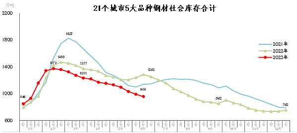 6月中旬,21個(gè)城市5大品種鋼材社會(huì)庫存為956萬噸,環(huán)比減少33萬噸,下降3.3%,庫存繼續(xù)下降;比今年初增加204萬噸,上升27.1%;比去年同期減少329萬噸,下降25.6%。
