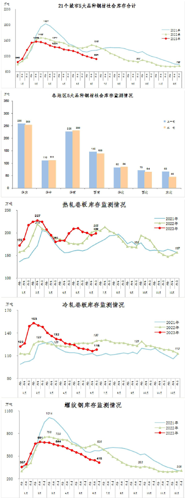 6月下旬,分地區來看,7大區域鋼材社會庫存環比各有升降,具體情況為:東北地區庫存環比減少21萬噸,下降32.3%,為減量、降幅最大地區;西南地區減少7萬噸,下降4.8%;西北地區減少6萬噸,下降8.6%;華東地區減少5萬噸,下降4.9%;華南地區庫存環比增加4萬噸,上升1.8%;華北地區增加2萬噸,上升2.4%;華中地區增加1萬噸,上升0.9%。