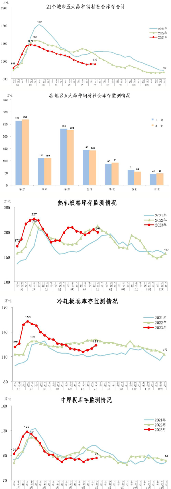7月中旬,21個城市五大品種鋼材社會庫存為932萬噸,環比減少5萬噸,下降0.5%,庫存略有下降;比今年初增加180萬噸,上升23.9%;比去年同期減少226萬噸,下降19.5%。