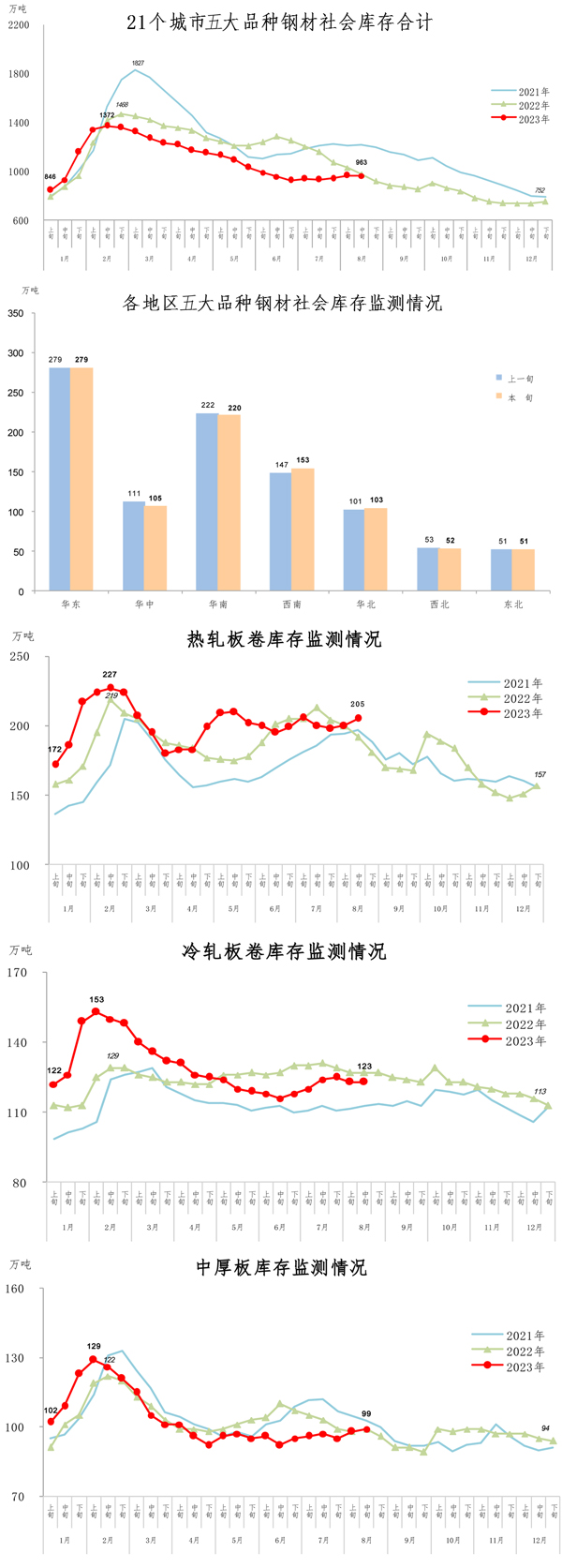 8月中旬,分地區來看,七大區域鋼材社會庫存各有升降,具體情況為:西南地區環比增加6萬噸,上升4.1%,為增量、升幅最大地區;華北地區增加2萬噸,上升2.0%;東北地區和華東地區持平;華中地區減少6萬噸,下降5.4%;華南地區減少2萬噸,下降0.9%;西北地區環比減少1萬噸,下降1.9%。