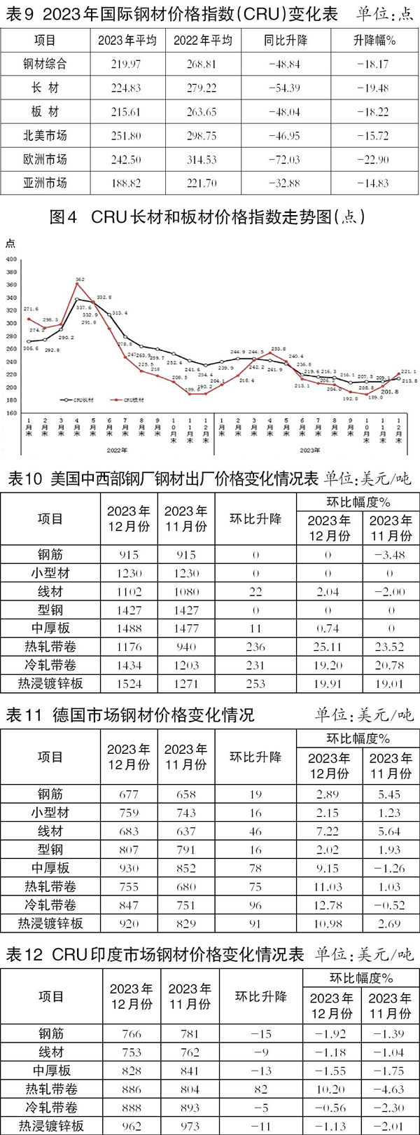 2023年12月份,CRU長(zhǎng)材指數(shù)為213.8點(diǎn),環(huán)比上升4.7點(diǎn),升幅為2.2%;CRU板材指數(shù)為221.1點(diǎn),環(huán)比上升19.3點(diǎn),升幅為9.6%。與2022年同期相比,CRU長(zhǎng)材指數(shù)下降20.6點(diǎn),降幅為8.8%;CRU板材指數(shù)上升30.3點(diǎn),升幅為15.9%。