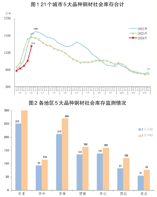 2月中旬,21個城市5大品種鋼材社會庫存為1212萬噸,環(huán)比增加256萬噸,上升26.8%,庫存大幅上升;比今年初增加483萬噸,上升66.3%;比2023年同期減少160萬噸,下降11.7%。