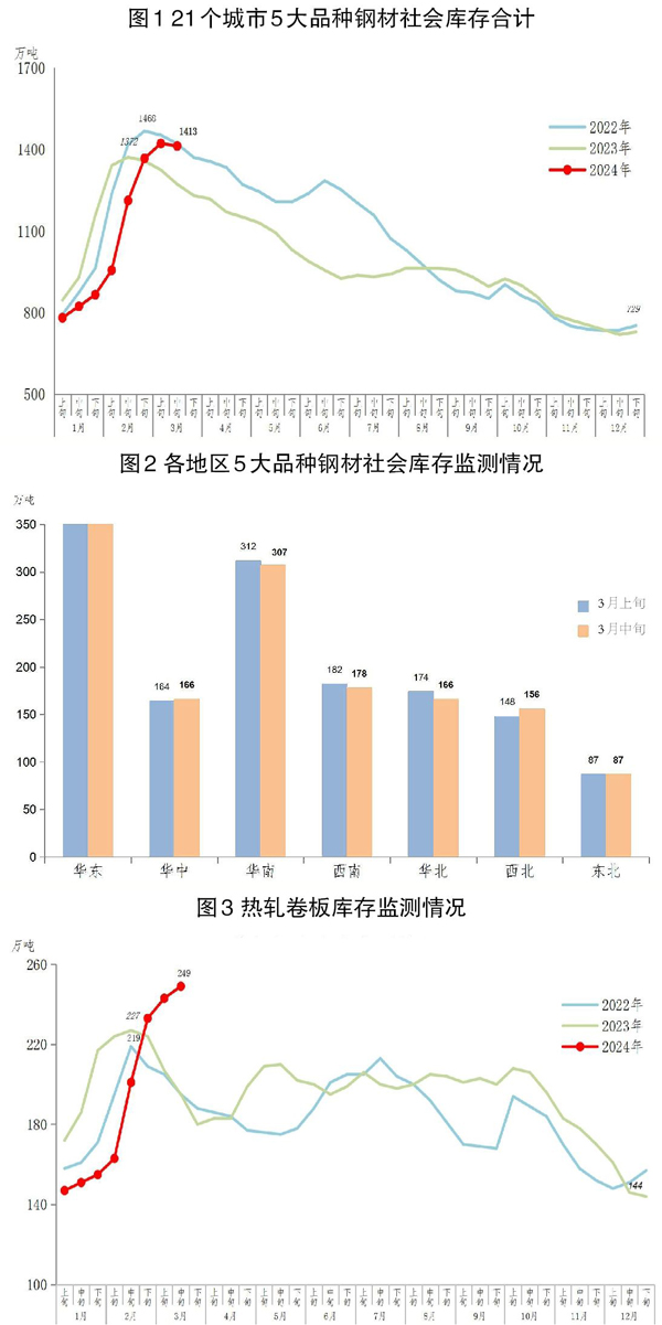 3月中旬,21個(gè)城市5大品種鋼材社會(huì)庫(kù)存為1413萬(wàn)噸,環(huán)比減少9萬(wàn)噸,下降0.6%,庫(kù)存連續(xù)8旬上升后轉(zhuǎn)為下降;比今年初增加684萬(wàn)噸,上升93.8%;比去年同期增加141萬(wàn)噸,上升11.1%。