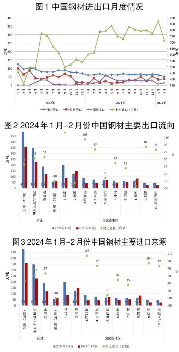 2024年以來(lái),國(guó)內(nèi)鋼鐵業(yè)受下游有效需求不足及春節(jié)假期后需求啟動(dòng)緩慢等因素影響,鋼材庫(kù)存增加,價(jià)格承壓下行,企業(yè)效益下滑。而境外鋼材價(jià)格表現(xiàn)相對(duì)堅(jiān)挺,我國(guó)企業(yè)出口動(dòng)力較強(qiáng),進(jìn)口需求不足,鋼材進(jìn)出口延續(xù)2023年走勢(shì),出口保持高位,進(jìn)口持續(xù)回落。需警惕的是,由于前期鋼材特別是中低端產(chǎn)品出口量大幅增加,目前貿(mào)易摩擦案件數(shù)量呈現(xiàn)增長(zhǎng)態(tài)勢(shì),出口企業(yè)要加強(qiáng)自律,規(guī)范出口秩序。