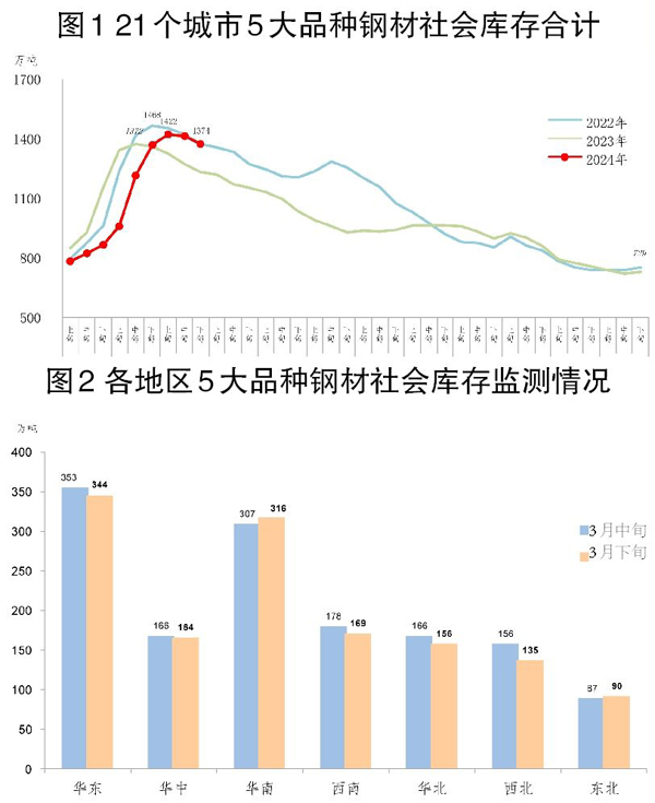 3月下旬,21個城市5大品種鋼材社會庫存為1374萬噸,環(huán)比減少39萬噸,下降2.8%,庫存繼續(xù)下降;比2月下旬增加7萬噸,上升0.7%;比今年初增加645萬噸,上升88.5%;比上年同期增加143萬噸,上升11.6%。