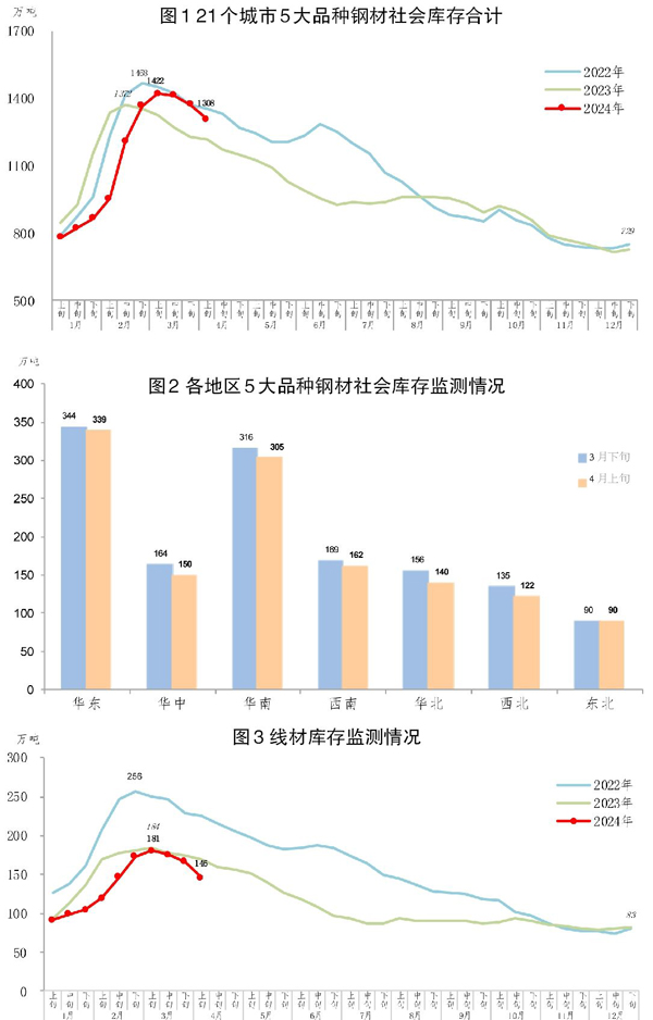 4月上旬,5大品種鋼材社會庫存環比全部下降,其中螺紋鋼和線材分別為減量和降幅最大品種。