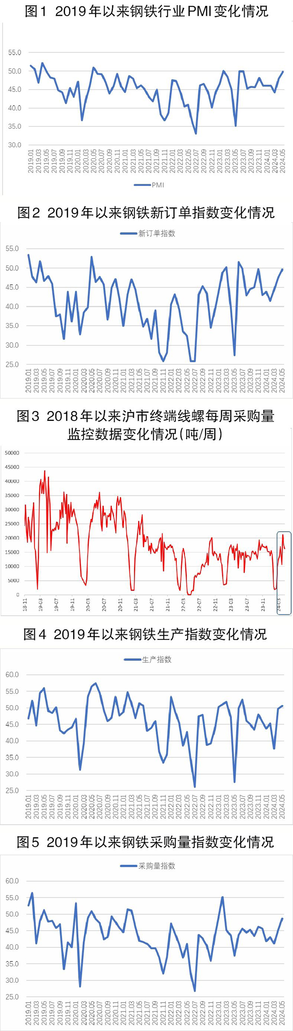 調(diào)控政策力度加大,鋼鐵需求趨穩(wěn)回升。5月份,隨著多地房地產(chǎn)政策優(yōu)化,部分城市房地產(chǎn)市場出現(xiàn)回升跡象,存量房逐步消化,地產(chǎn)開工、施工端傳出些積極信號,建筑鋼材需求有所好轉(zhuǎn)。超長期特別國債、大規(guī)模設(shè)備更新和消費品以舊換新繼續(xù)發(fā)揮對鋼材需求預(yù)期的提振作用,因此盡管鋼鐵行業(yè)面臨季節(jié)性影響,但在調(diào)控政策的帶動下,鋼材需求整體趨穩(wěn)回升,新訂單指數(shù)為49.6%,較4月份上升2.2個百分點,連續(xù)3個月明顯上升。鋼材出口需求也保持增長,新出口訂單指數(shù)為52.2%,雖較4月份下降0.8個百分點,仍連續(xù)3個月處于擴張區(qū)間。市場終端需求方面,根據(jù)監(jiān)測的滬市終端線螺采購數(shù)據(jù)來看,5月份上海終端采購量環(huán)比微降3%,變化不大。